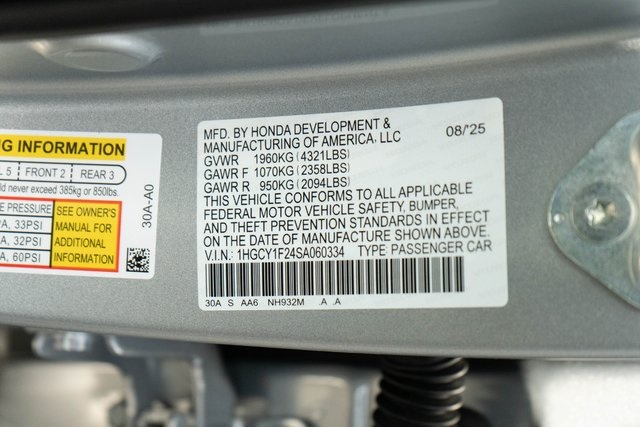 Solar Silver Metallic 2025 Honda Accord LX FWD CVT 1.5T I4 DOHC 16V Turbocharged VTEC 29/37 City/Highway MPG Nh-932m/Black Cloth.We offer prime and subprime financing. Also, make sure to ask about the exclusive Rome Honda Advantage Customer Care*, included on all New ane preowned Vehicle Purchases - 1 Year or 15,000 miles of Paintless Dent Removal - Tire and Wheel Protection and Windshield Repair, See dealer for complete details. Shottenkirk Honda Rome is proud to serve Rome, Cartersville, Floyd, Bartow, Adairsville, Cave Springs, Cedartown, Rockmart, Calhoun, Resaca, Trion, Summerville, Cedar, Bluff, Centre, Cobb, and Kennesaw. We are here to help with all your sales, parts, and service needs. Advertised Price is plus tax, tag, and documentation fee. See dealer for details.Tax, Title and Tags not included in vehicle prices shown and must be paid by the purchaser. While great effort is made to ensure the accuracy of the information on this site, errors do occur so please verify information with a customer service rep. This is easily done by contacting us or by visiting the dealership.** Due to current market volatility, we are pricing our vehicles immediately following acquisition. All vehicles will be reconditioned and made ready for sale. Price will be the advertised price plus, TT&L, Registration, and $899.00 dealer documentation fee, any other fees or charges that are allowed or prescribed by law. Any quoted financing terms are subject to final lender approval and are only estimates.**Under 97,000 miles will receive a month/6,000 miles powertrain warranty. Vehicles over 97,001-119,999 will receive a 3-month/3000 miles powertrain warranty. No coverage on vehicles over 120,000 miles. Some restrictions apply; please call us for a copy of the contract for specific information. Certain restrictions may apply. See dealer for details.