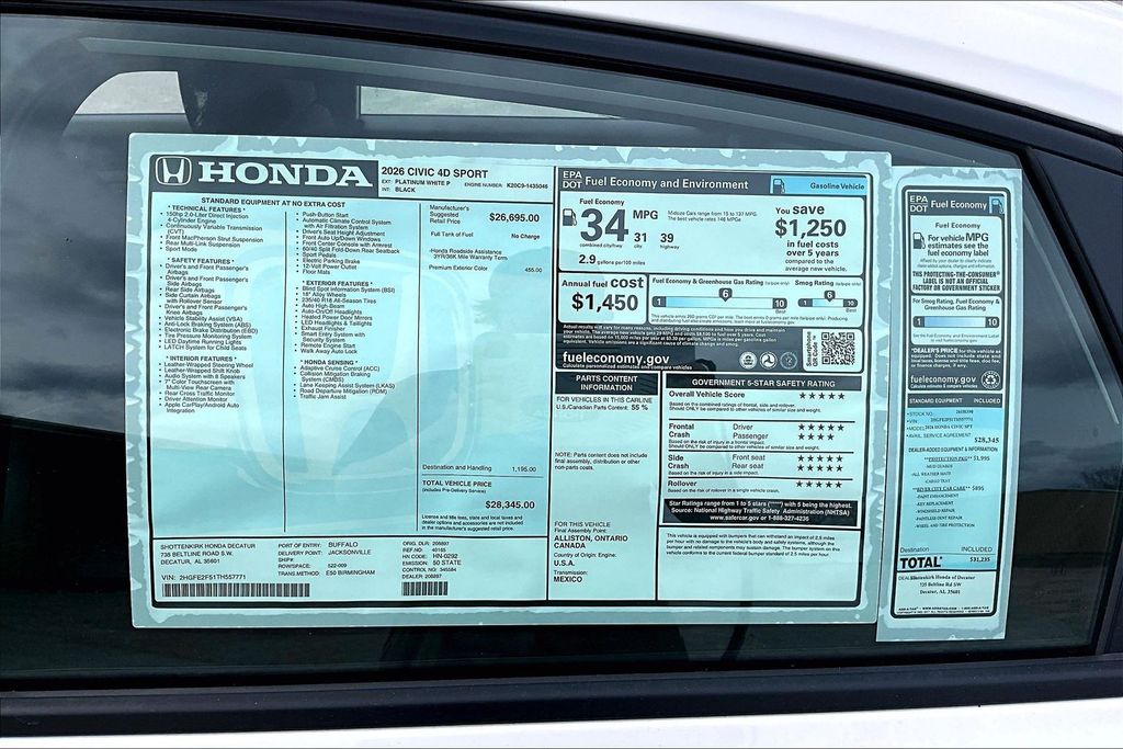 Apple CarPlay, Android Auto, Adaptive Cruise Control, Back Up Camera, Lane Departure, Remote Start, Civic Sport, 4D Sedan, 2.0L I4 DOHC 16V, Platinum White Pearl, Nh-883p/Black Artificial Leather. Platinum White Pearl 2026 Honda Civic Sport FWD CVT 2.0L I4 DOHC 16V