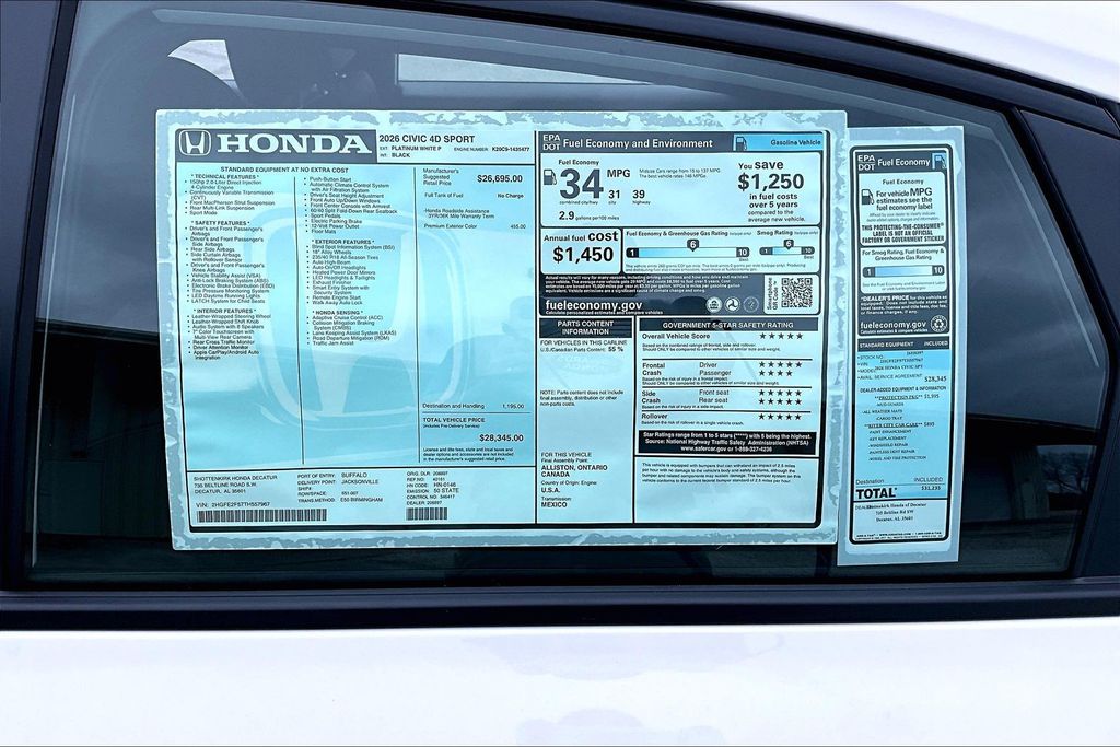 Apple CarPlay, Android Auto, Adaptive Cruise Control, Back Up Camera, Lane Departure, Remote Start, Civic Sport, 2.0L I4 DOHC 16V, FWD, Platinum, Nh-883p/Black Artificial Leather. Platinum 2026 Honda Civic Sport FWD CVT 2.0L I4 DOHC 16V
